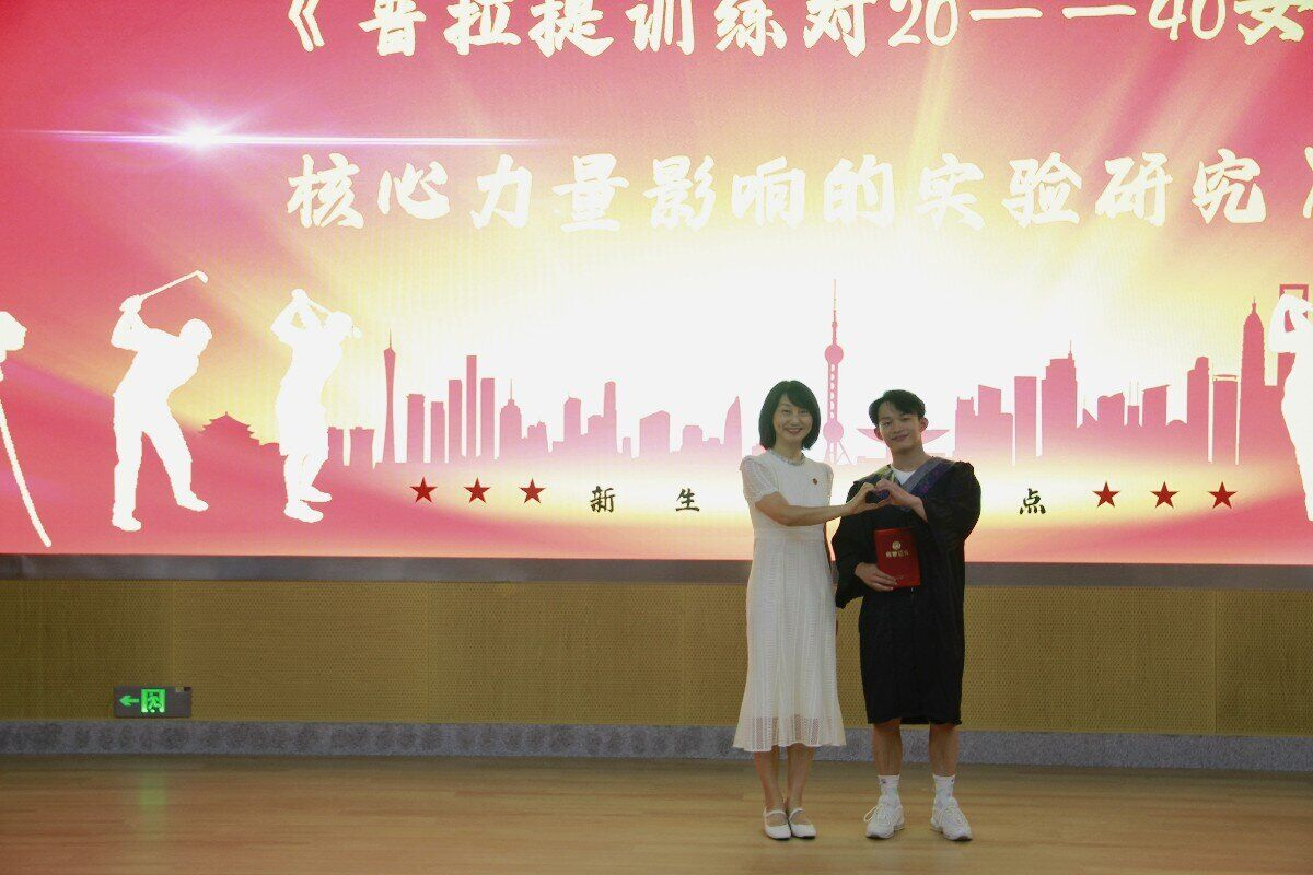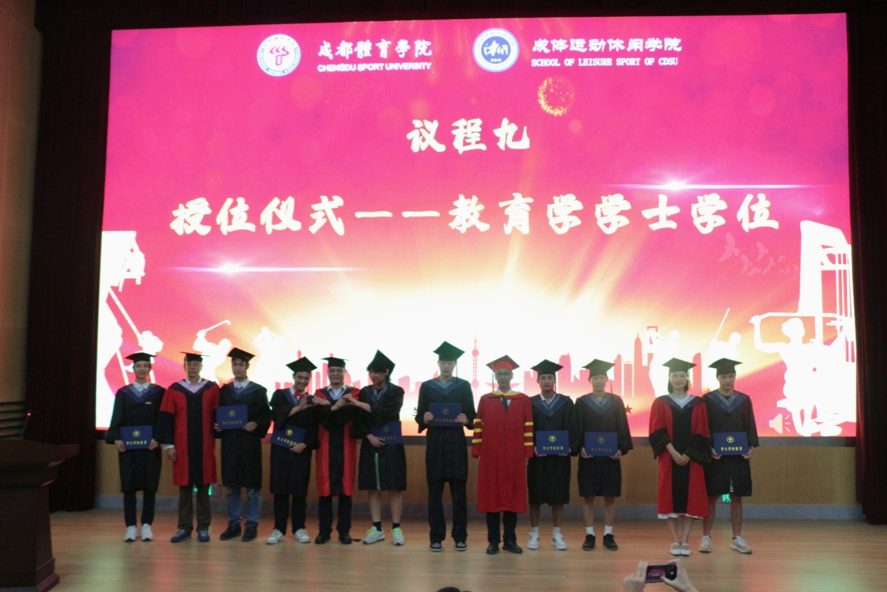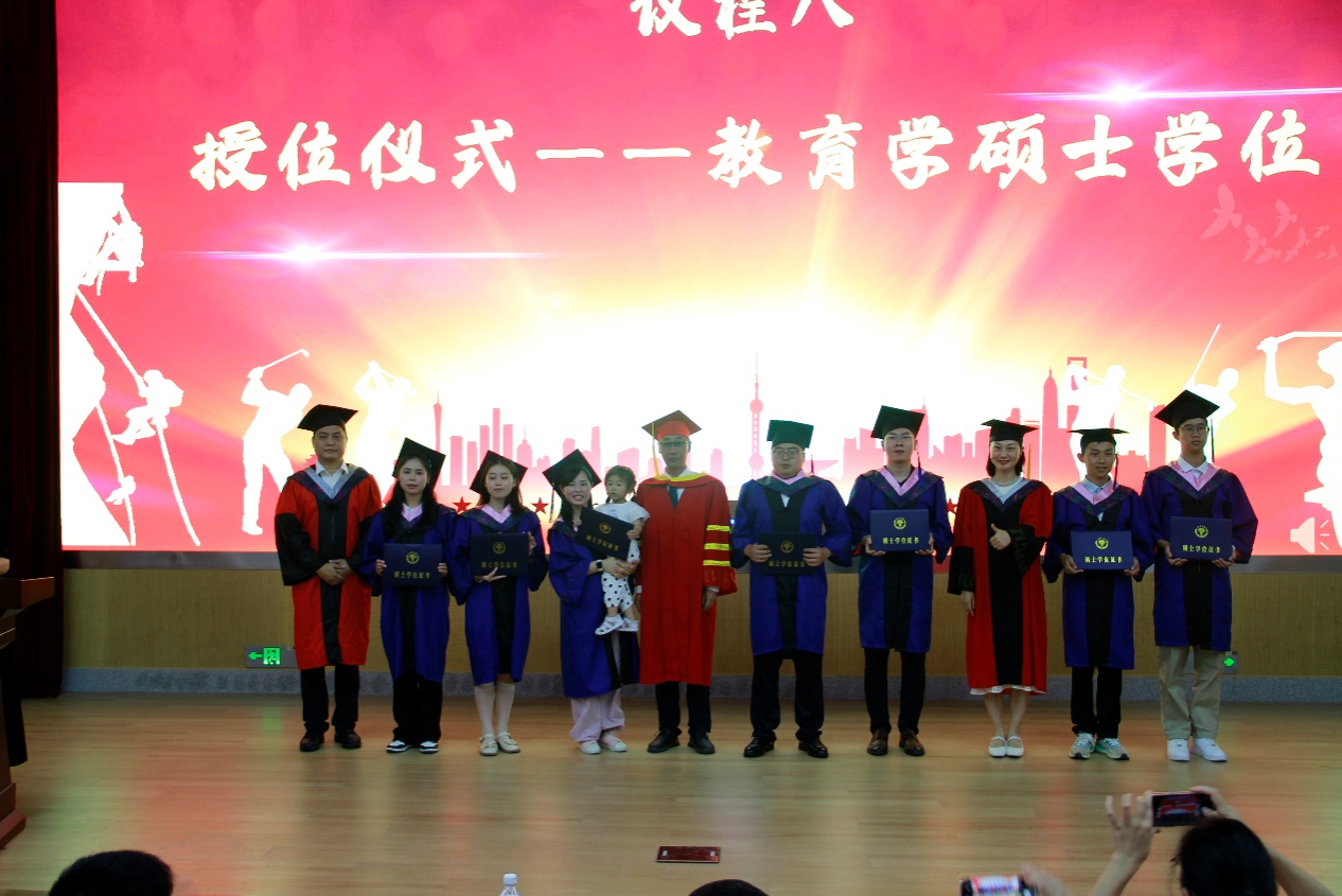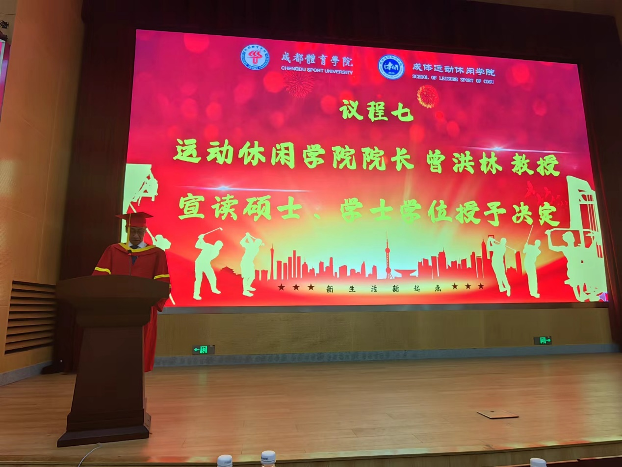 随后,运动休闲院经理曾洪林教授宣读硕士、学士学位授予决定,曾洪林教授、闫虹副教授、蒋书君副教授为获得硕士学位同学授位。曾洪林教授、舒建平教授、闫虹副教授、蒋书君副教授、徐鹏老师上台为获得教育学学士学位同学授位。